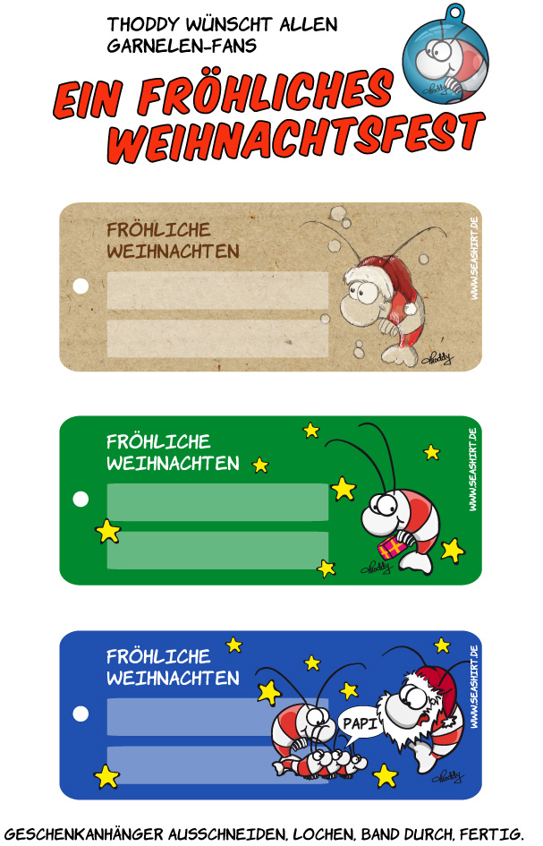Die meisten von Euch basteln sich die Geschenkanhänger sicherlich selber, doch wer es dann doch nicht mehr geschafft hat, der kann sich meine Garnelen-Weihnachtsgeschenkanhänger runterladen, ausdrucken, ausschneiden und anbändseln.