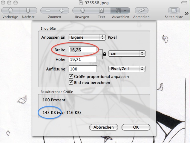 4. Und da könnt ihr dann einfach zb. die Breit/Höhe verändern (Rot), passt sich, wenn Ihr nur z.B. die Breite angibt, mit der Höhe ganz Automatisch an, weiter unten seht ihr dann eine Vorschau wie groß das Bild dann sein wir (Blau)