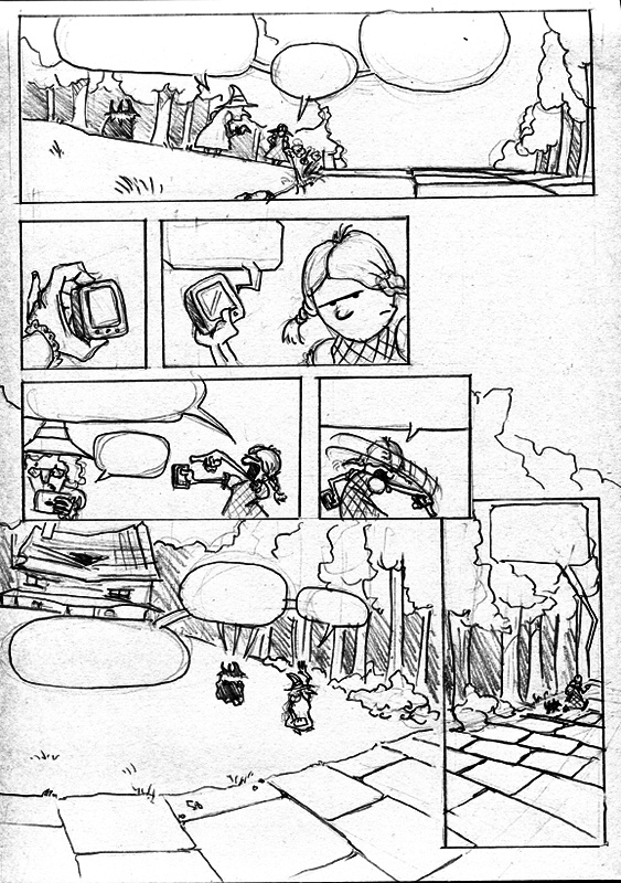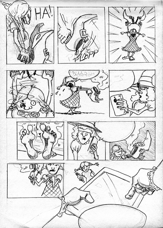 der stil gefällt mir sehr gut - ich finds auch krass wie viele panels du auf einer seite unterbringst. es liest (also sieht - bin gespannt was für text da noch kommt) sich flüssig, ist witzig und viel zu schnell vorbei. von mir aus behalte lieber den "rohen" stil bei und mach mehr seiten als zu viel nachbearbeitung. obwohl, wer weiß wie gut das erst wird wenn es richtig fertig (und farbig?!?) ist...