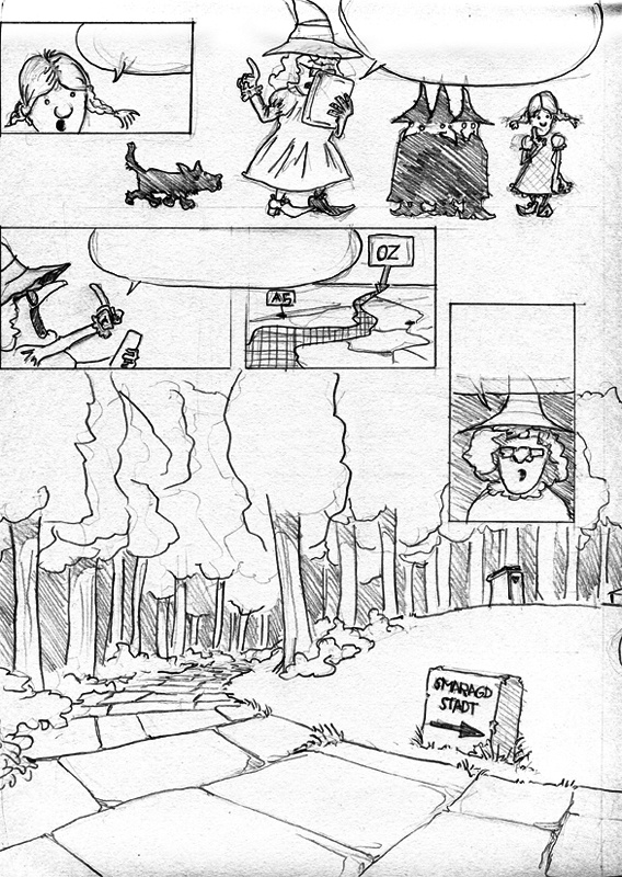 Gestern abend hab ich n Meeting/Kaffeeplausch mit meinem ehemaligen Dozenten gehabt. Dem hab ich meine Oz-Geschichte unter die Nase gerieben....is immer wieder faszinierend, den Menschen zum Lachen zu bringen. Sein Tipp war: erstmal die ganze Sachen durchstricken und dann erst drüber nachgrübeln, ob es getuscht werden soll und wie die Farben aussehen sollen.