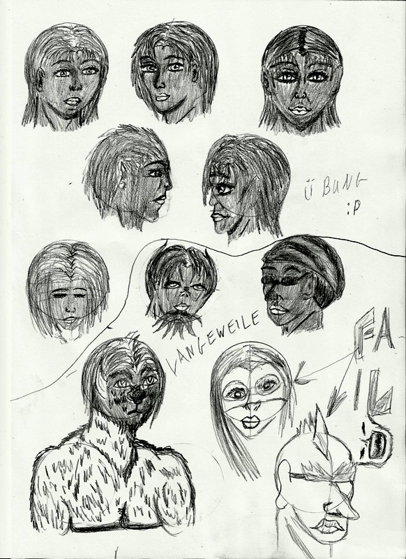 Tschuldige fürs schreien, aber was ich sagen will, ist, dass selbst nichtgelungende Zeichnungen nicht weggeworfen gehören, sondern genauso aufbewahrt werden sollten, wie die guten. Auf diese Weise erstellt man sich selber einen kleinen Katalog, welche Fehler man bei Zeichnungen machen kann. Des weiteren kann selbst eine misslungene Skizze irgendwann später doch noch Verwendung finden, weil vielleicht einem die Idee gut gefällt. Außerdem sieht man daran, in wie weit man sich verbessert hat, wenn man ein älteres Bild später nochmal neu anfertigt.