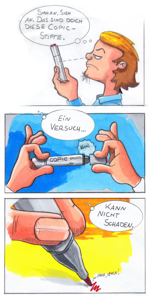 Ich habe ein kleines Bild gemalt, weil ich mich so über meine neuen Sketch-Copics freue :D . Ich hatte bisher nur ein paar Graustufen und 3 Farben für eine Simpsons-Zeichnung. Jetzt habe ich ein paar mehr und probiere grade rum, bis jetzt finde ich sie gut. So fing das an, im Laden: