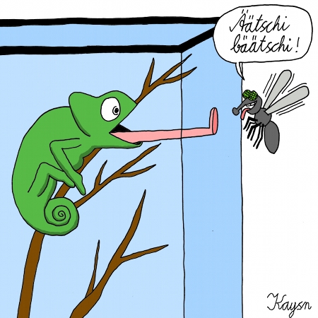 Den Gag könnte man noch steigern, indem die Fliege auf dem Glasdeckel sitzt, während das Chamäleon an seiner Zunge von der Decke herab baumelt... ^^