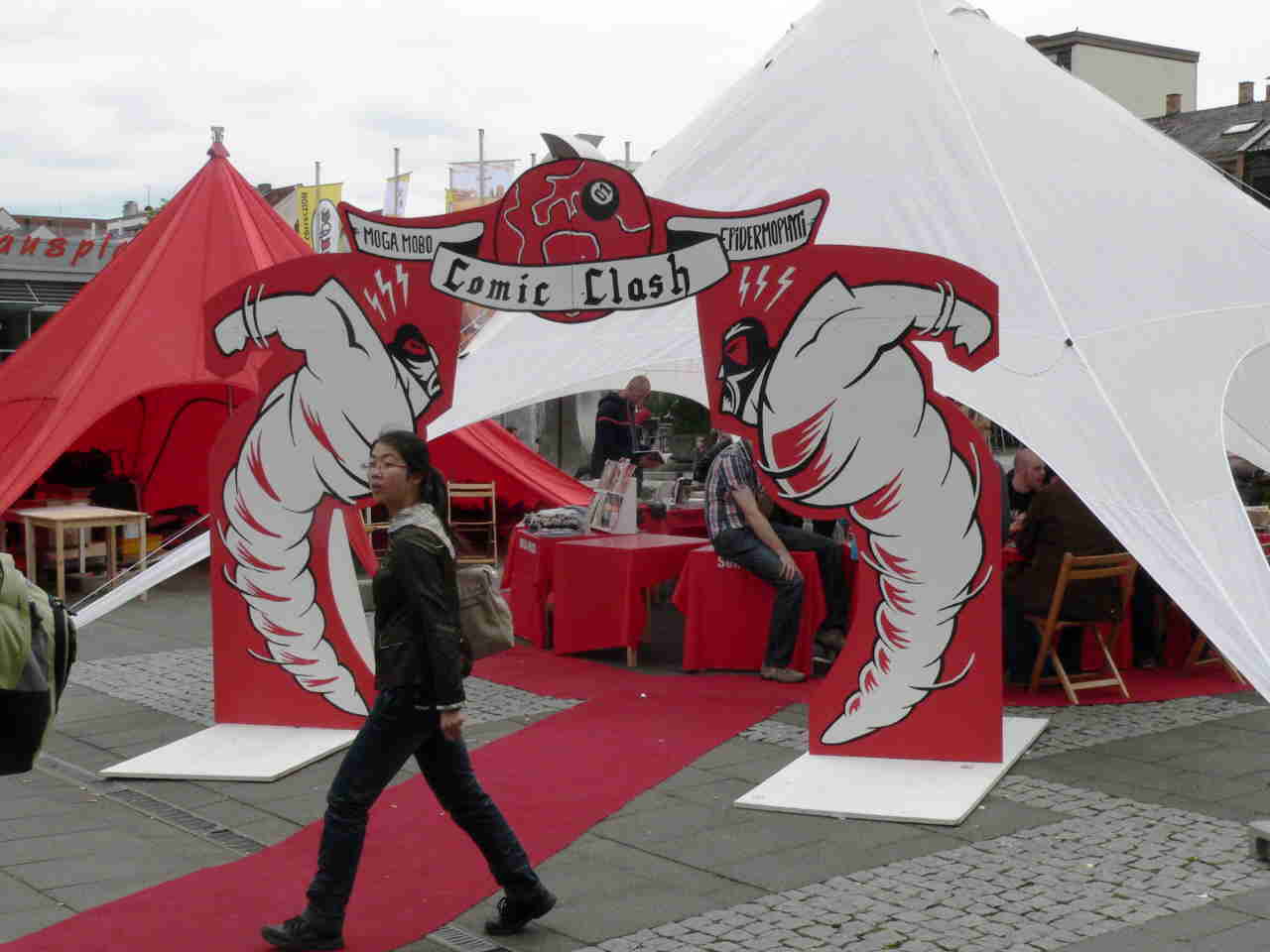 Viele kenne ich ja mittlerweile, aber es ist immer wieder sehr spaßig, Leute zu treffen, die man vorher nur aus dem Internet kannte und sich komplett anders vorgestellt hat. Leider hat meine Comic-Ausbeute dieses Jahr sehr zu wünschen übrig gelassen. Mein Geld reichte nur für das ganze Gratis-Zeug, das "Traurige-Würmchen"-Heft von Rastafisch, das er mir aus lauter Mitleid geschenkt hat, als er hörte, dass meine Freundin und ich wegen Hotel-Mangels im Auto schlafen mussten