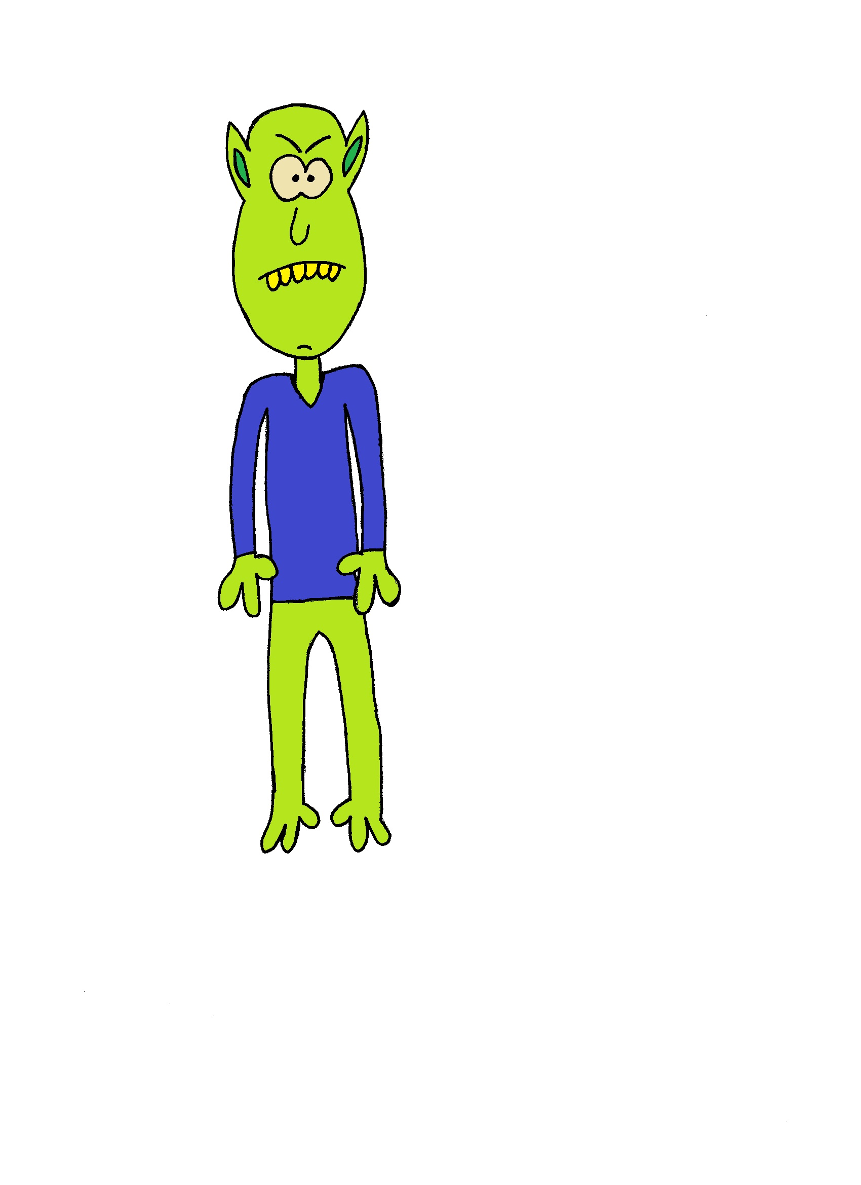 Ich habe mir mal erlaubt, Dein Bild zu räubern und einfach draulos mal was drumherum zu zeichnen. Das habe ich mit "Paint" und meiner ollen Ball-Maus (sowas gibt's noch!) gemacht, das hat etwa 20 Minuten gedauert. Wenn Dir das nicht recht ist, dann lösche ich das natürlich wieder, es ist ja DEIN Werk. Es soll nur mal so ein Beispiel sein, was man z. B. machen könnte, wenn man gerade ein Alien gezeichnet hat.