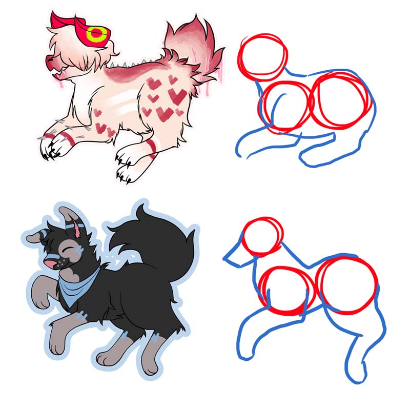 Erklärung zu den Bildern: Du fängst mit den Kreisen an. Kopf, Brustkorb, Hinterteil, je nachdem wo du sie haben willst. Dann 'verbindest' du die Teile und haust die direkt sichtbaren Beine dran (ist Übungssache, natürlich kann man da noch viel viel weiter skizzieren aber das kann man immer, das hier ist nur wirklich grob). Die Hinteren Beine, die Schnauze und alles sind im Vergleich zu dem Kleinkram. Mit mehr Haaren siehts dann auch mehr Hund aus und bekommt mehr Charakter. Genauso kannst du auch mit jeglichen anderen Hunden vorgehen, geht dann nur darum die Beine länger zu ziehen oder ne Schnauze dran zu hängen oder die taille breiter zu machen, für Diversität. (das zweite Bild da unten)