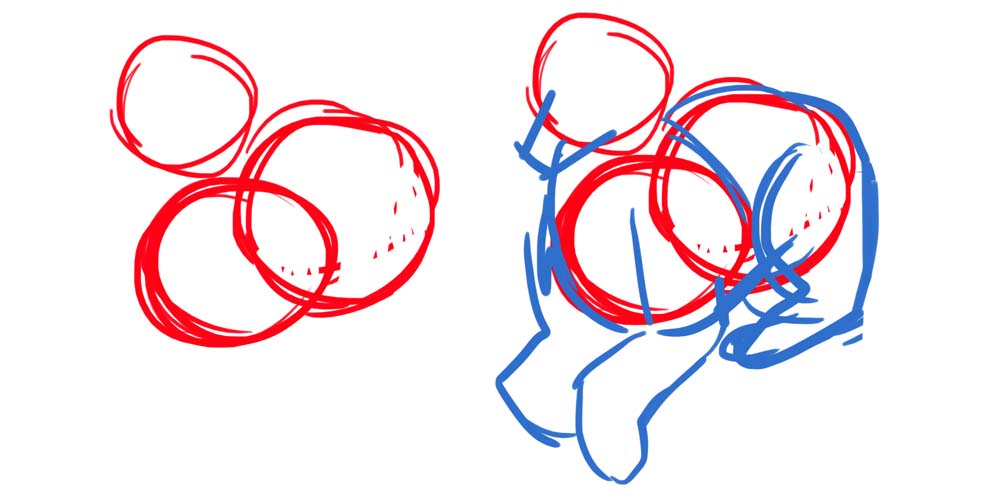 dann, bei anderen Perspektiven musst du dir vorstellen die Kreise seien nicht in 2-dimensionalem sondern in 3-Dimensionalem Raum und schiebst sie quasi hintereinander (woah ich hoffe das ist verständlich....) wie im dritten Bild. dann verbindest du sie quasi genauso und haust genauso die direkt sichtbaren Beine dran (in diesem Fall warens beide vorderen und das eine hintere)