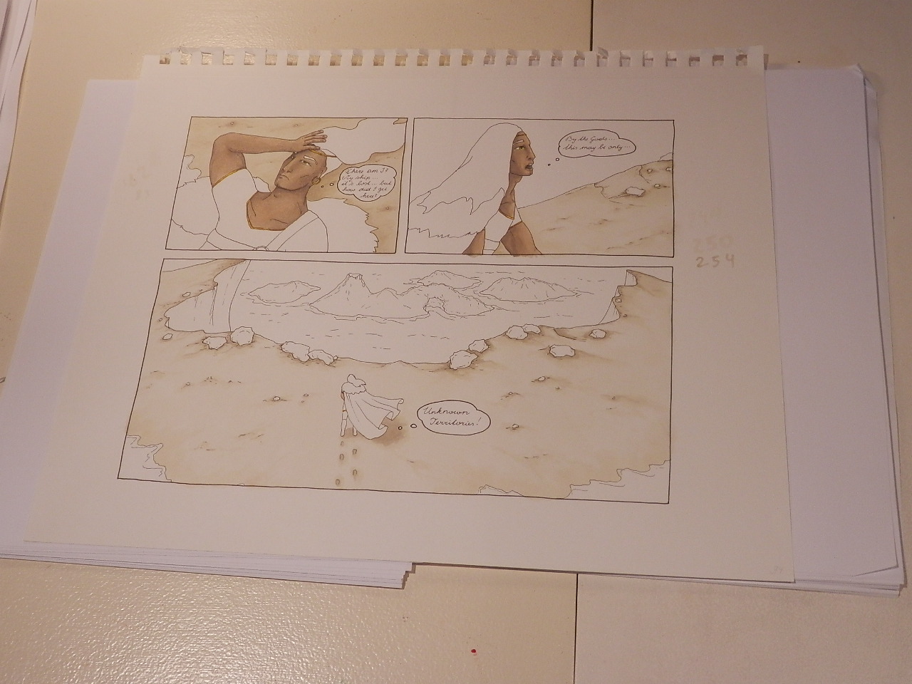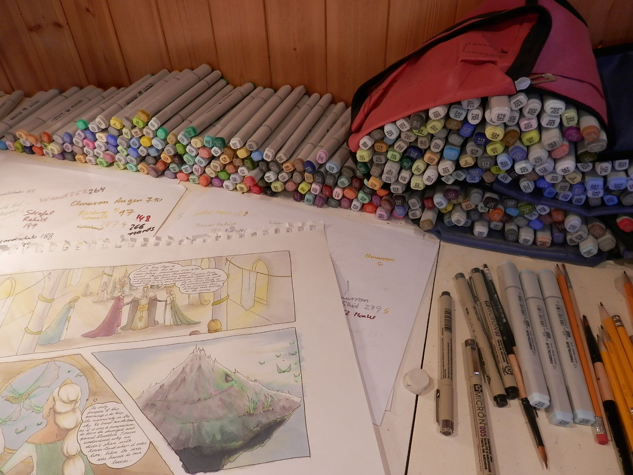 . Insgesammt brauche ich gar nicht so lange, um eine Seite fertig zu stellen. Schwarz-Weiss Grundierung und Text brauchen etwa 2 Stunden, je nach Detailgrad der Szene. Kolorienen beläuft sich meist auf 3-5 Stunden. Grob gesagt also 7 Stunden pro Seite.