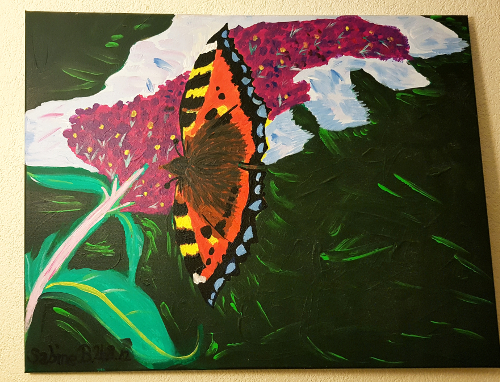 Ein sehr dekoratives Bild, das ich mir sofort ins Wohnzimmer hängen würde. Die Technik kann ich nicht genau erkennen. Ist der Schmetterling da irgendwie hineincollagiert oder auch gemalt (aber jedenfalls kein Aquarell)?
