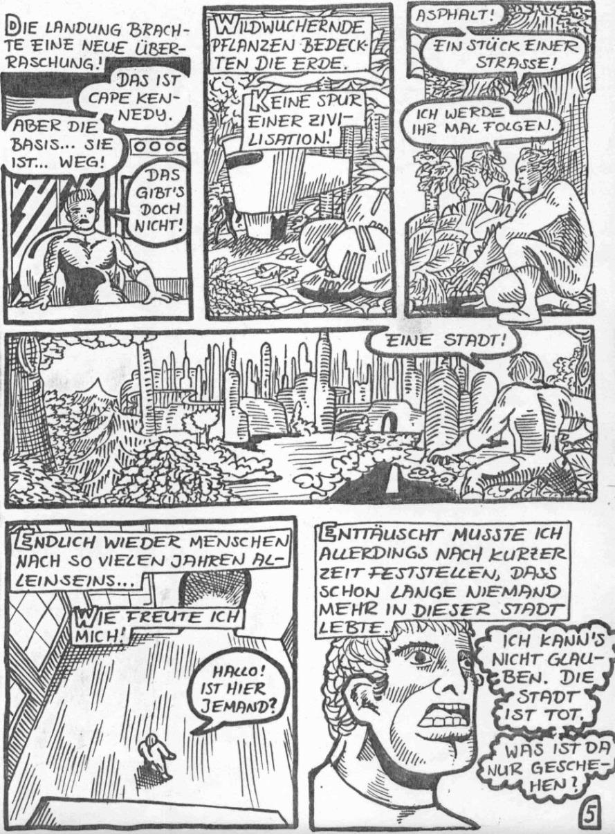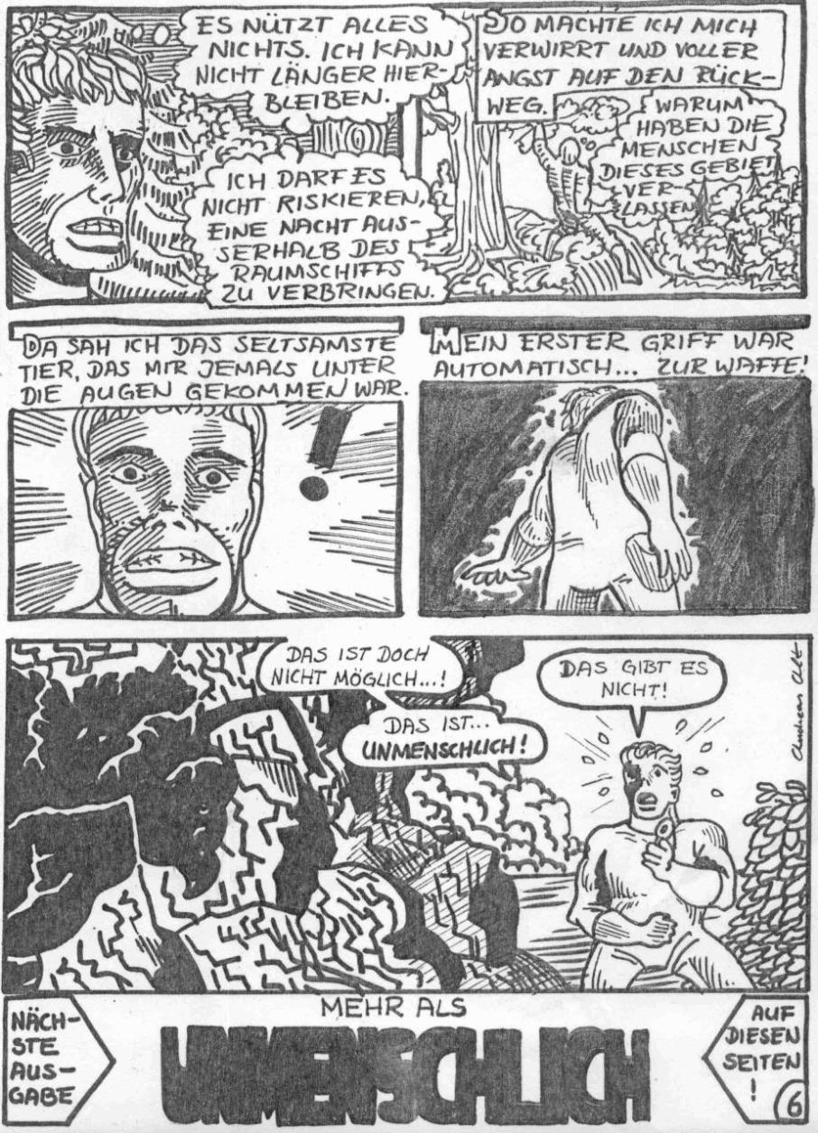 Teil 4 besteht offenbar nur aus einer Seite. Soweit ich mich erinnere, habe ich die Serie damals abgebrochen und stattdessen mit "Tete à Tete" begonnen. Das wurden am Ende sieben Teile, und der Comic war damit abgeschlossen. Ich vermute, bei "Etro Shar" wußte ich schlicht nicht, wie ich weitermachen sollte. Ich habe immer schon einen Hang, einfach draufloszuzeichnen. Meistens geht das sogar gut. Aber hier hatte ich alle Schockeffekte durch und kam nicht weiter. Ich glaube, ich dachte, bei Marvel geht die Serie ja auch einfach immer weiter, ohne daß es einen Schluß gibt - das müßte ich doch auch schaffen...