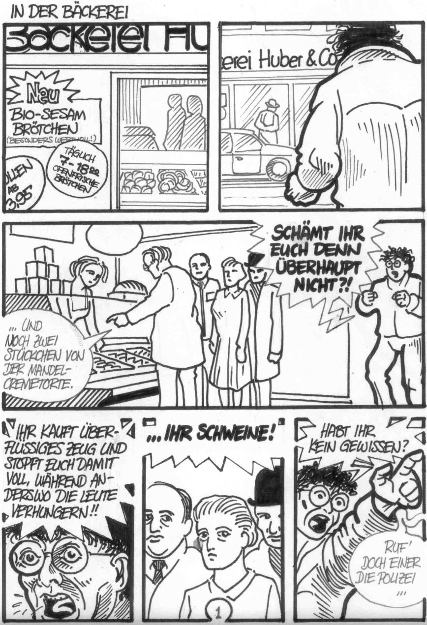 Aber jetzt geht's weiter. Dieser Comic gehört unbedingt noch in die Reihe meiner realitätsnahen Werke. Diese Szene habe ich live erlebt (habe mich aber diesmal nicht in den Comic hineingemalt). In Zeiten der Querdenker kommt sie einem schon fast ganz normal vor. Aber ich war damals schwer ergriffen und wußte nicht so recht, was ich davon halten sollte. Also habe ich sie gezeichnet und mich eines Standpunkts dazu enthalten. "In der Bäckerei" war damals Gegenstand von einigem Spott und auch von Parodien - naja, nicht ganz zu Unrecht.