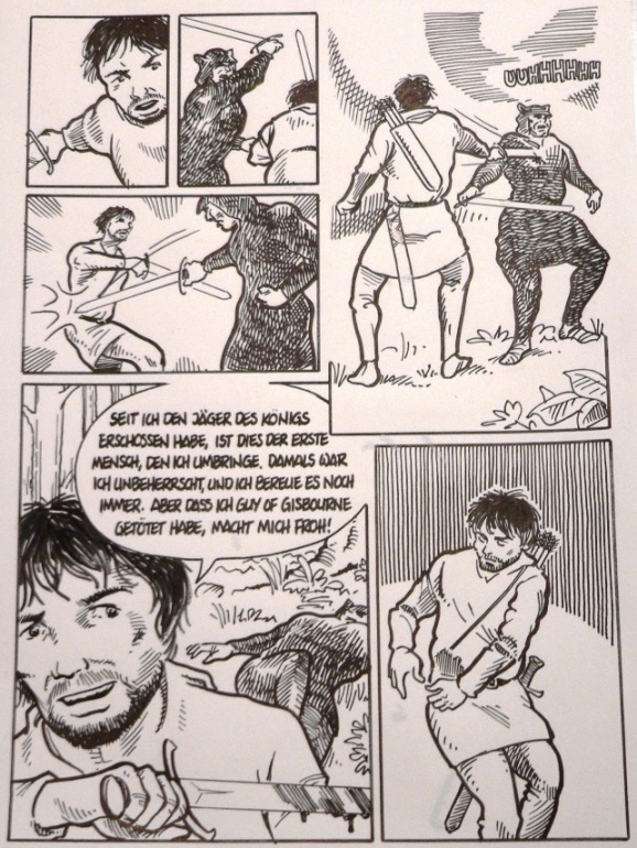 Robin Hood säuberte sein Schwert und steckte es in die Scheide zurück. Mit verschränkten Armen stand er vor dem Gefallenen. "Seitdem ich als hitzköpfiger Jüngling den Förster des Königs erschoß, ist das der erste Mensch, den ich getötet habe", murmelte er. "Ich denke noch oft mit Bitterkeit an das Opfer meiner Unbeherrschtheit, aber daß ich diesen da ins Jenseits befördert habe, macht mich so froh, als hätte ich einen wilden Eber getötet, der Feld und Flur zerstörte."