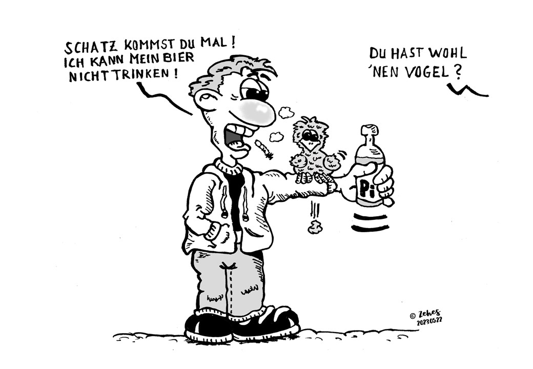 Das Bierglas steht auf dem Kopf, weil der Henkel falschrum gezeichnet ist. Sonst finde ich den Cartoon auch schön gezeichnet.