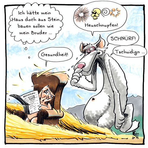 Gefällt mir sehr gut - vor allem wegen dem Tausch der Rollen (das strenge Schwein, der betretene Wolf).