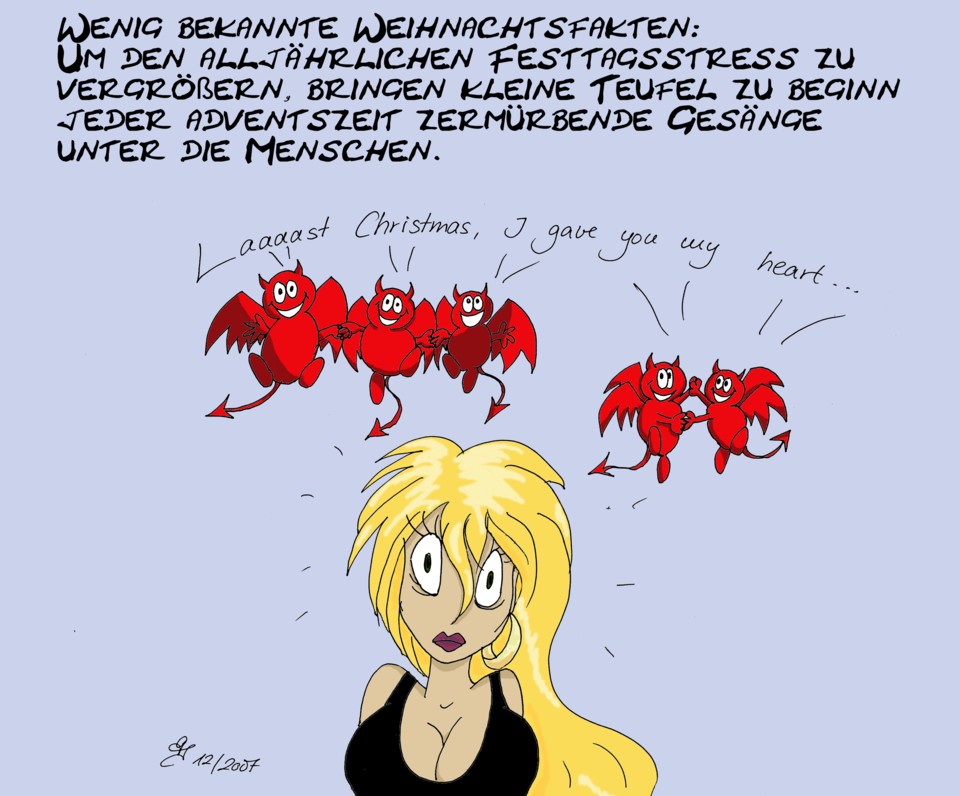Einen neuen Cartoon gibt's auch (erwähnte ich schon, dass mich die Weihnachtszeit produktiv macht?) - ich gestehe hiermit öffentlich, ich habe meine Wette mit DMJ verloren und war den geisttötenden Klängen von "Last Christmas" ausgesetzt. Abgesehen von dem posttraumatischen Schocksyndrom hat die Sache wenigstens einen neuen Toon gebracht - mit meiner ganz persönlichen Theorie über Weihnachtsmelodien... ;)