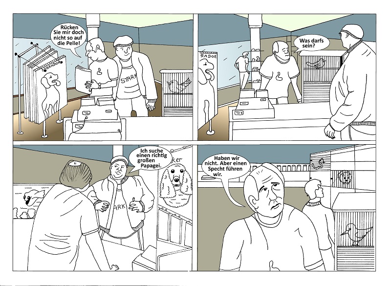 Peter, ich meine meine neue 2-seitige kleine Comic bestehend aus 8 Panels. Titel: In der Tierhandlung