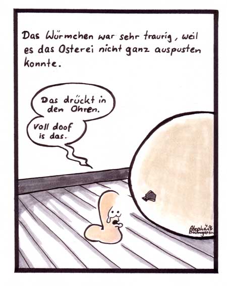 Ich hoffe doch das traurige Würmchen hatte trotz des nicht ganz ausgeblasenen Ostereis ein schönes Osterfest, aber wahrscheinlich war trotzdem alles doof? :D