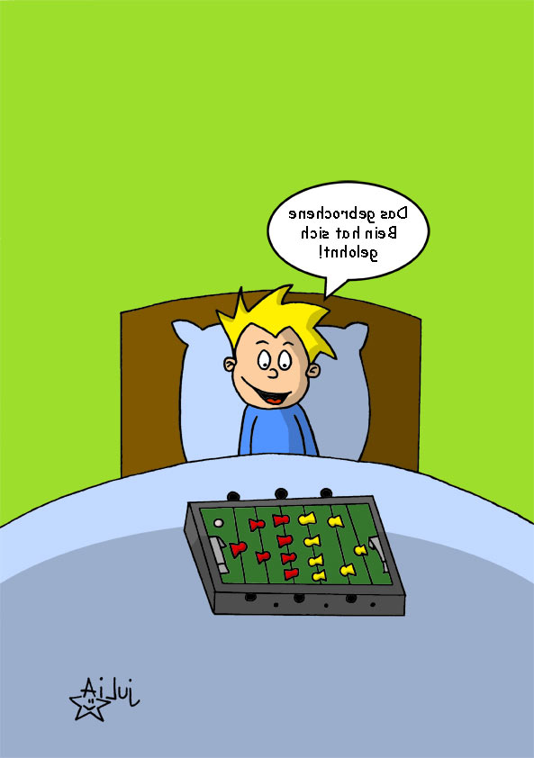Das Kickerspiel ist ebenso perspektivisch inkorrekt. Es geht auch im Spielfeldinnenraum nicht in die Tiefe. Tore sind auch irgendwie krumm und schief. Insgesamt wirkt das Kickerspiel falsch.