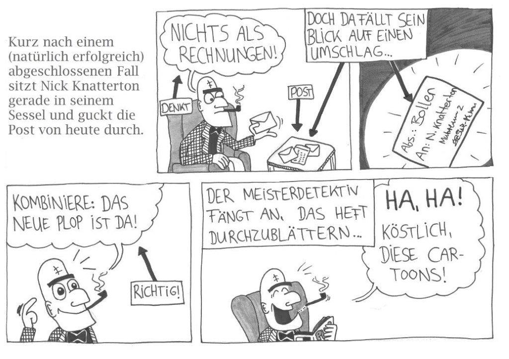 ja, ich hätte da was: Ich habe vor ein paar Wochen mal eine Nick Knatterton-Parodie angefangen zu zeichnen, in welcher eine gestohlene PLOP-Ausgabe die Hauptrolle spielt. :D