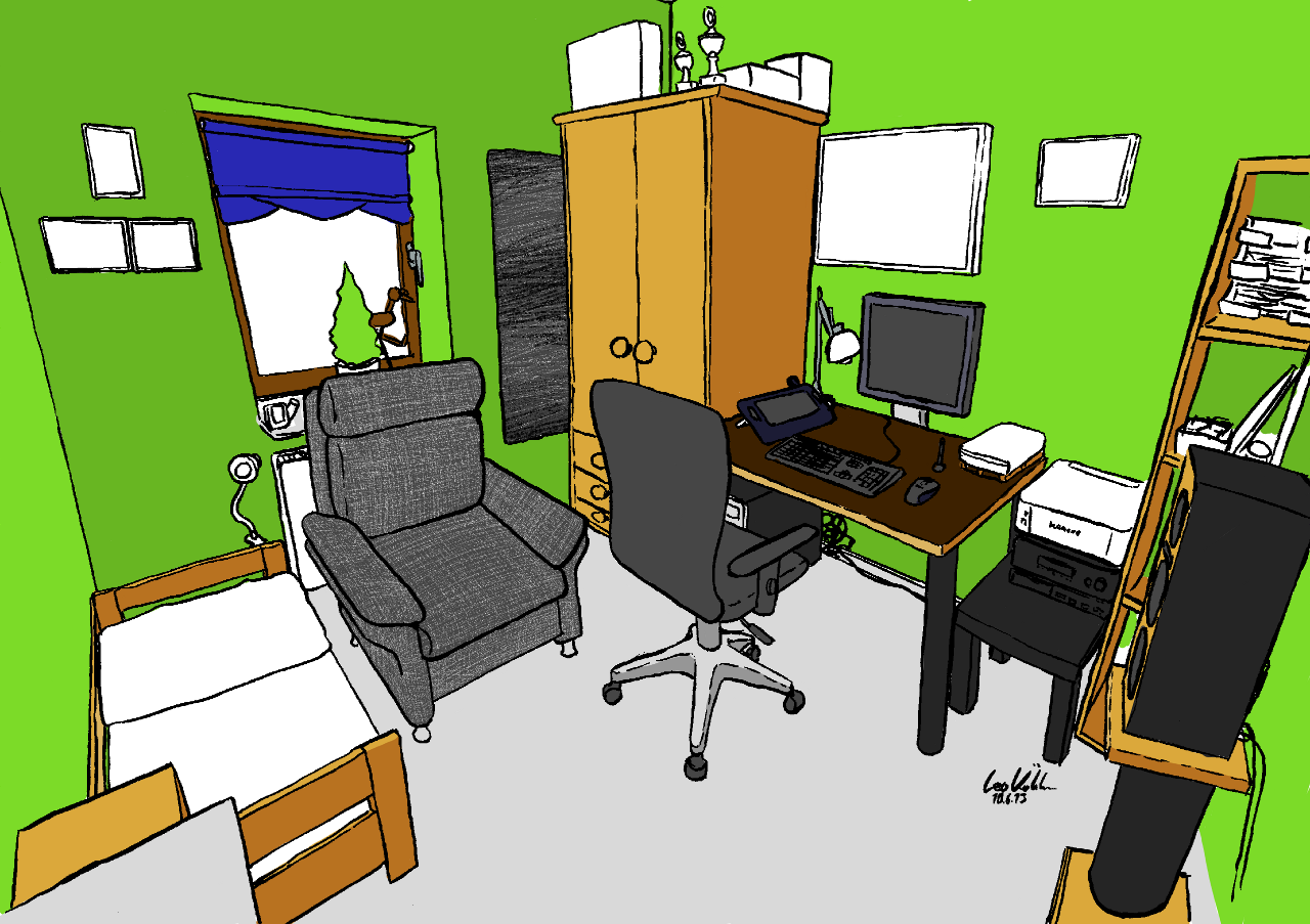 Der Sessel macht das ganze zwar ein wenig eng, aber ist genial zum Musik hören, was ich am zweit liebsten mache, nach Zeichnen natürlich ^^ Man sieht hier nur einen Lautsprecher, der andere steht auf der Seite der Tür, die näher am Betrachter ist, also außerhalb des Sichtfeldes. Und "die Kamera" steht auf den Audiogeräten, die in Gebrauch sind.