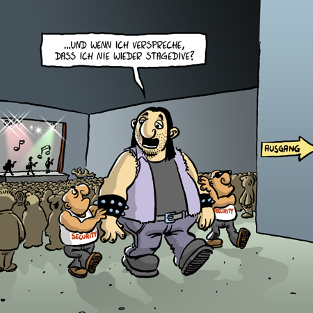 Der Typ, der da in meinem Cartoon von der Security hinaus begleitet wird, hat offenbar einen Stagediver gemacht und bei seinen Körperausmaßen ist das den Zuschauern wohl nicht sehr gut bekommen.