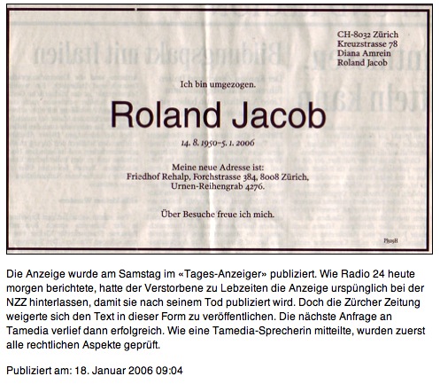 Also ich bin erst total erschrocken, weil ich dachte, dass wäre nicht von dem Verstorbenen selber gekommen... dann hätt ich das überhaupt nicht gut gefunden... gut... ok... der Mann hatte Humor, aber für die Hinterbliebenen ist es sehr schwer, wenn mit dem Tod der geliebten Person so flapsig umgegangen wird... weiss nicht... bin etwas zwiespältig in meiner Meinung