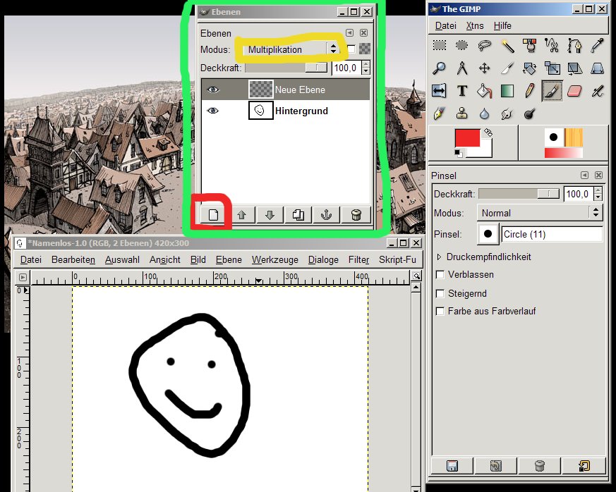 Für eine neue Ebene musst du auf das Symbol klicken, das ich rot umrandet habe. Und den Modus "Multiplikation" stellt man da ein, wo ich gelb umrandet habe.