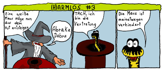 Den dritten find ich klasse, wäre aber besser gewesen, wenn die Schlange nur gesagt hätte, die Maus ist leider verhindert und der Schwanz noch rausgeguckt hätte, oder so... bloß nicht zu viel erklären, was man auch zeigen kann.