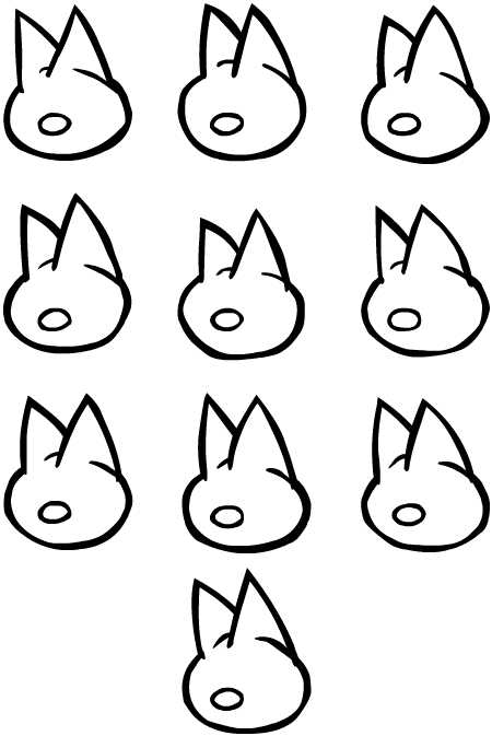 Ich würde sagen die Augen etwas größer und oben abgeflacht für den herrischen Blick. So sieht es noch etwas niedlich, aber auch "debil" aus, weil die Augen im Vergleich zum Kopf so klein sind.