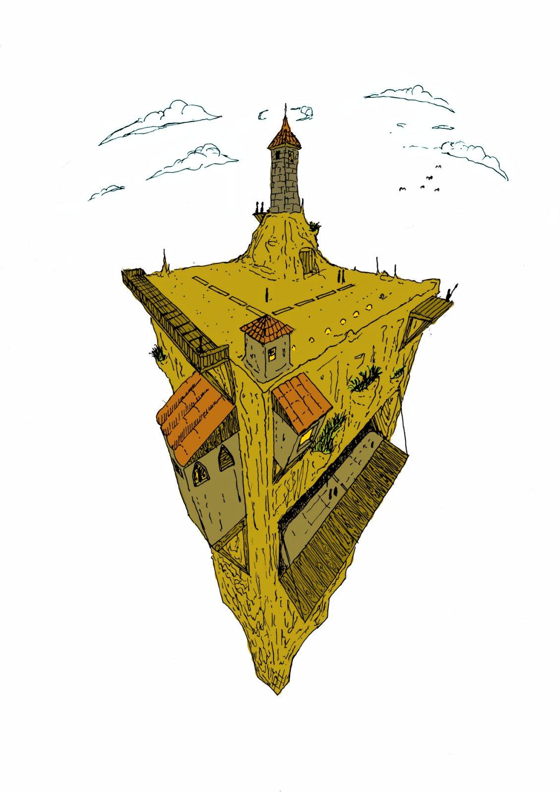 Die Idee von deiner fliegenden Stadtinsel finde ich klasse. (Hab selber mal so etwas auf einem A2 Bogen gemalt, hatte aber einen anderen Grundidee.