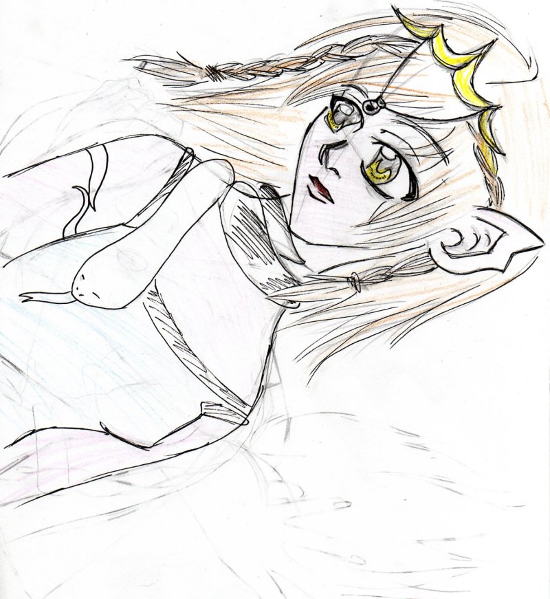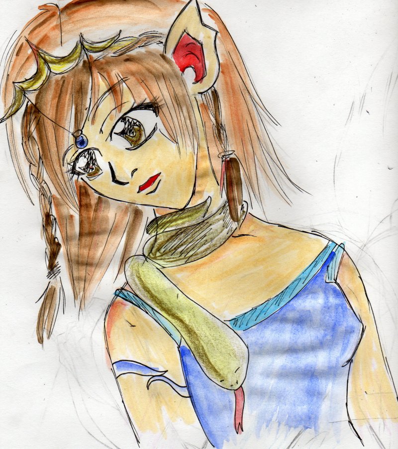 Kann mich Lilas Kritik anschließen - die Schlange ist nicht besonders authentisch, dito die Ohren. Was den Oberarmreif betrifft, der wirkt, als wäre er aufgemalt / tätowiert etc, zeichne ihn doch lieber ein wenig erhaben.