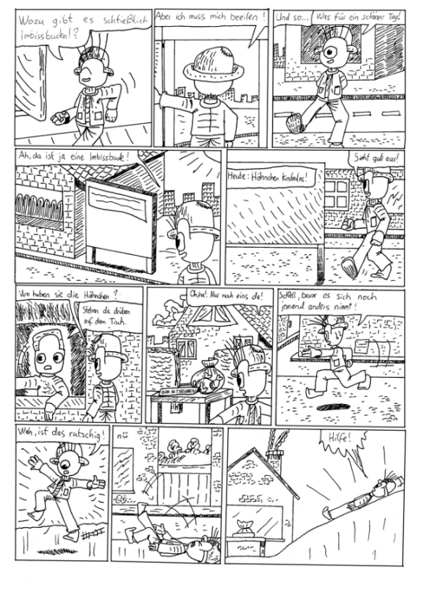 Danke für die Antworten! Der Tipp mit dem Platz zwischen den Panels ist sehr gut, auch das mit der Laufrichtung der Figurn.Der Comic wird übrigens noch eingefärbt und per pc gelettert. Ich möchte die Seiten aber so schnell wie möglich zeigen, und darum zeige ich erstmal das Original. Hier noch mal als "Kostprobe" die erste Seite vom Weihnachtscomic, diesmal koloriert: (ich hoffe, man kann es noch erkennen...)