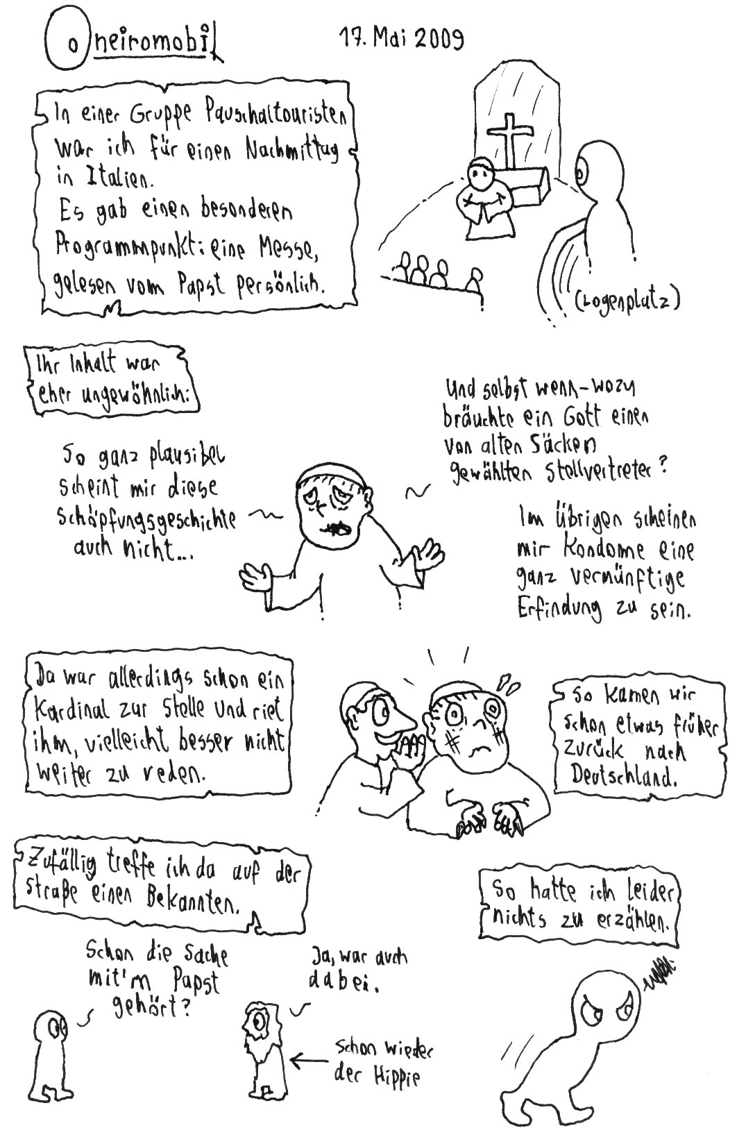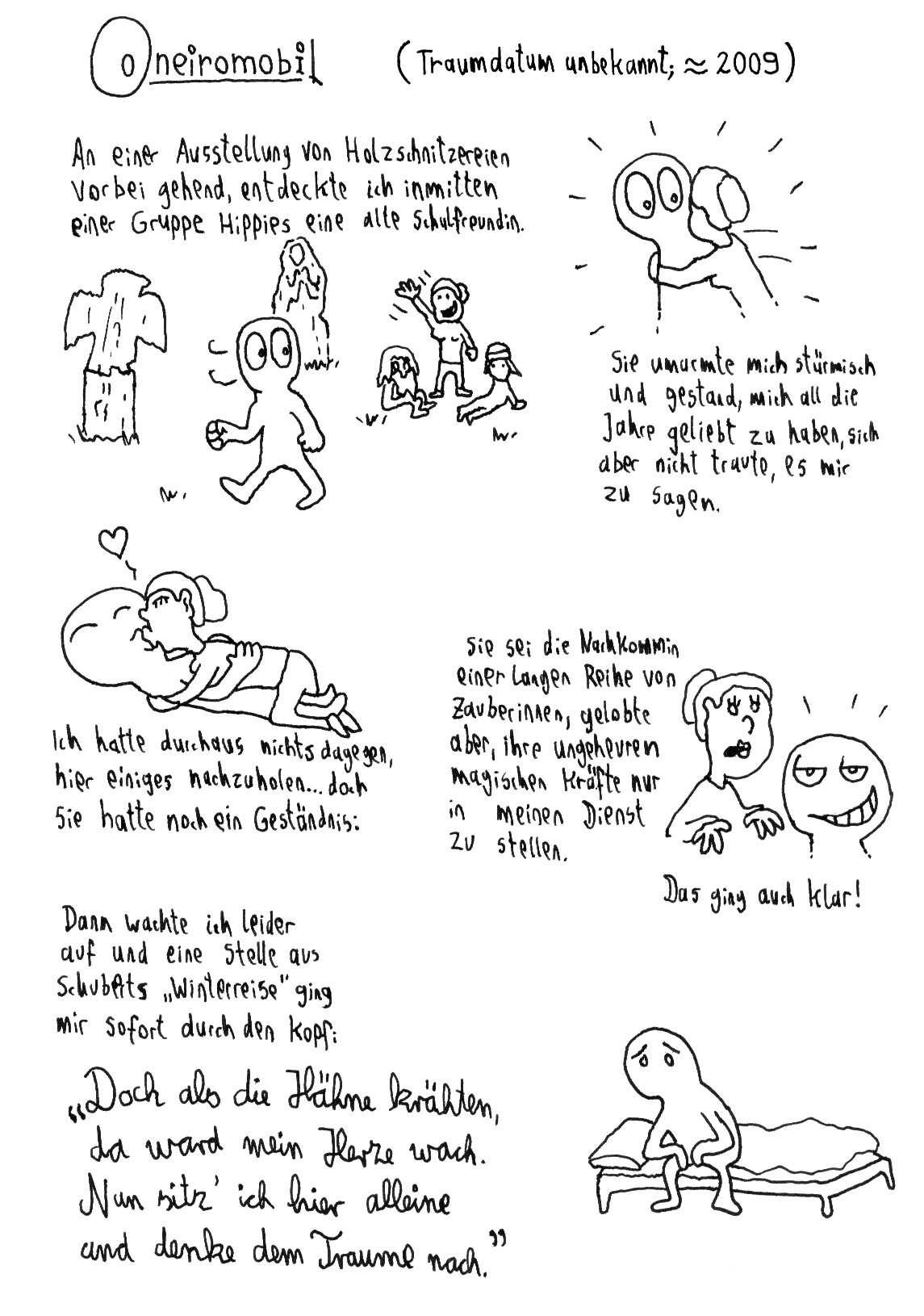 Wie das Leben so spielt, hatte ich auch kürzlich wieder was Oneiromobil-würdiges geträumt und werde es hier auch demnächst einstellen. Ist noch nicht eingescannt, aber schon gezeichnet - dann zeigte ich es übrigens einer Bekannten, ohne zu bedenken, dass sie Psychologie studiert...hoffentlich habe ich ihr damit nichts falsches offenbar. :D