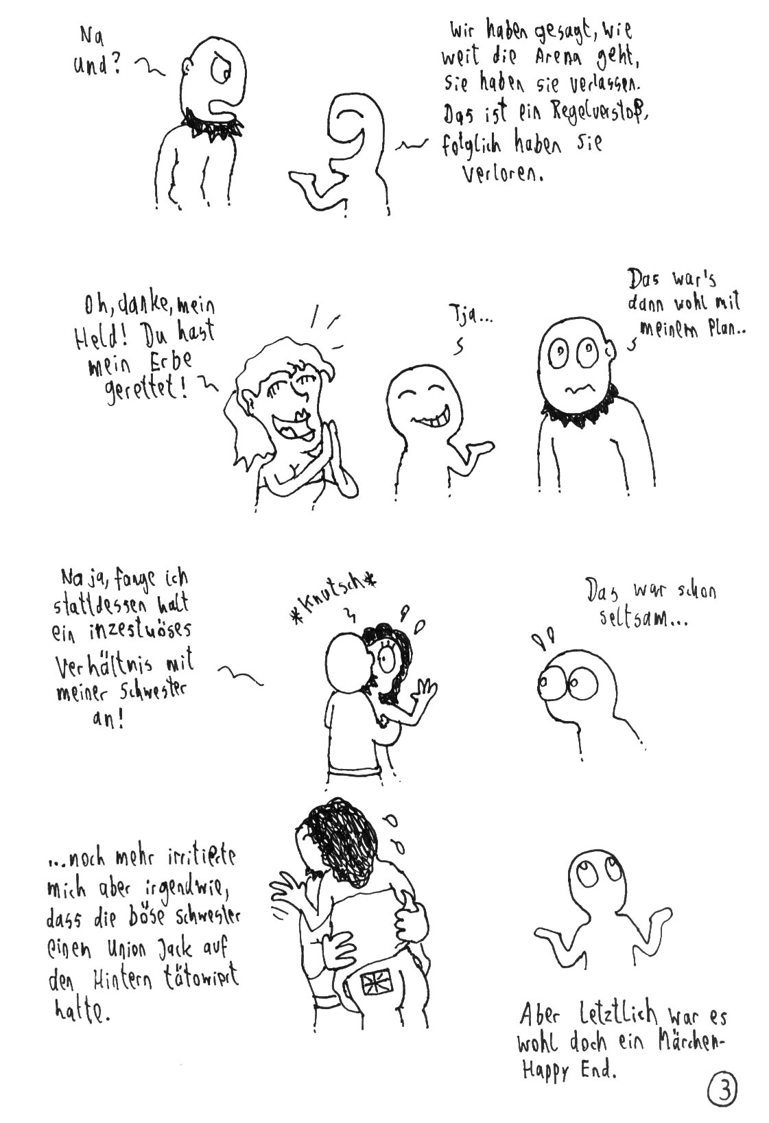 Wie gesagt, es war ja auch nie zwingend vorgesehen, immer einen direkten Erzähler zu haben, aber meist die einfachste Lösung, um das irrationale Geschehen zusammen zu halten. Bei dieser weirden Einzelszene funktioniert es natürlich auch ohne. Schick geworden!