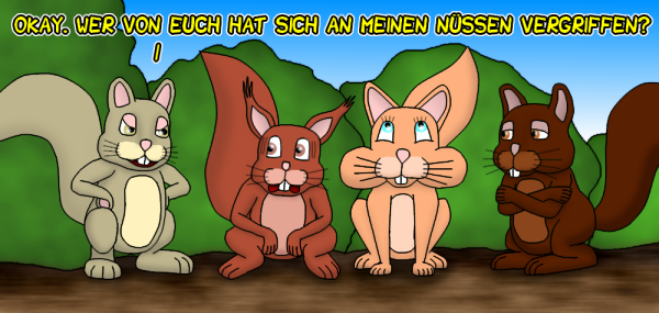 Bis jetzt nicht, aber mir sind beim Zeichnen ein paar Ideen gekommen. Deswegen bin ich auch etwas in eine Charakterstudie (sagt man das so?) abgedriftet, was dem Witz wohl nicht gut getan hat. Ursprünglich sollten Hörnchen #2 und #4 dem offensichtlich Schuldigen wissende und leicht verärgerte Blicke zuwerfen, aber am Ende hatte ich so viel Spaß verschiedene Gesten, Mimiken und Körperhaltungen auszuprobieren, dass die eigentliche Idee ziemlich verwässert wurde. Na ja, streng genommen war es sowieso nur ein Alibi-Gag, damit ich mich mal mit meinen gewohnten Werkzeugen an Hörnchen versuchen konnte. :D