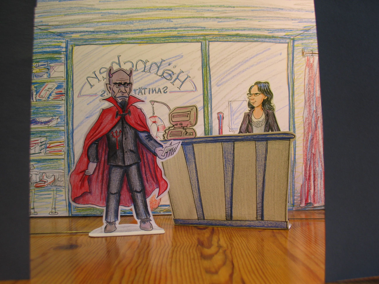 Vielleicht zeige ich hier demnächst mal Figuren und Kulissen eines Stücks, das leider noch nicht existiert, weil die erste fertige Szene bei einer Lesung im kleinsten Kreis so was von durchgefallen ist, dass ich alles samt und sonders schamvoll in einer Kiste versenkt habe, die ich seitdem nicht wieder ausgepackt habe, was, glaube ich, ein bisschen übertrieben ist.![]()