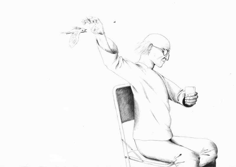 Sehr kunstvolle Zeichnung. Die erhobene Hand ist allerdings (für mich) nicht so genau zu erkennen. Da flattert ein Vogel, oder? Was sich da tut, kann ich aber nicht erkennen. Aber insgesamt gefällt mir das grafisch sehr gut.