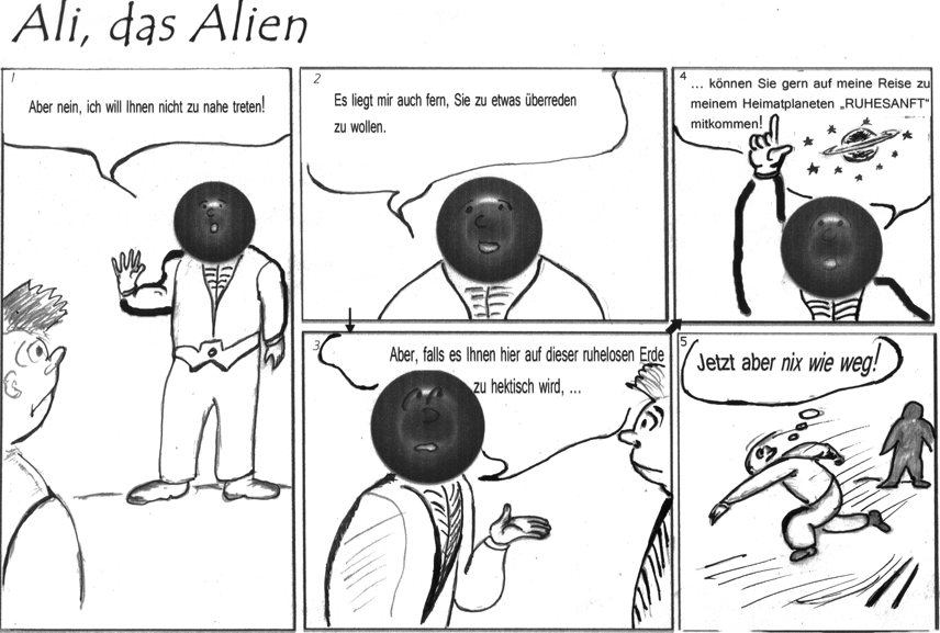 Dann stört die Anordnung der Panels etwas den Lesefluss. Es ist nun mal nicht so elegant, wenn man den Leser mit Richtungspfeilen durchs Layout leiten muss. Ich hätte Bildchen Nr.3 rechts neben Nr. 2 gesetzt und in die untere Reihe Nr. 4 und 5. Manchmal scheint dir die Tinte "aus dem Ruder" zu laufen. Aber eine uneinheitliche Strichstärke kann natürlich auch eine persönliche Note werden und die Grafik lebendig machen. Trotzdem stört es mich persönlich, wenn der Strich so extrem zwischen fett & tiefschwarz und dürr & grau schwankt. Ich persönlich hätte es gerne harmonischer, und sei es nur dadurch, dass man ein Prinzip dahinter erkennen kann (z.B. fette Outlines und zarte Schraffuren). Ist aber wirklich Geschmackssache, finde ich.