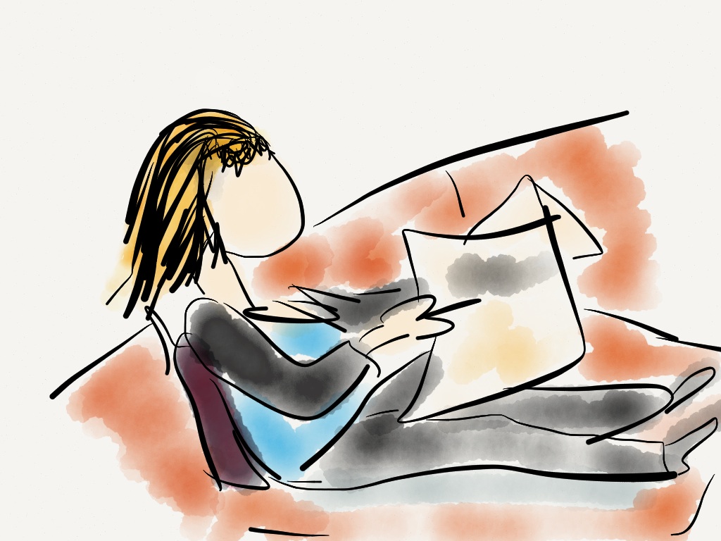 Daß da wer sitzt und Zeitung liest, erkennt man schon. Der Stil erinnert mich ein bißchen an Claire Bretecher. Ein Gesicht fehlt halt. Das ist zugegeben das Schwerste, aber würde die Zeichnung erheblich aufwerten.