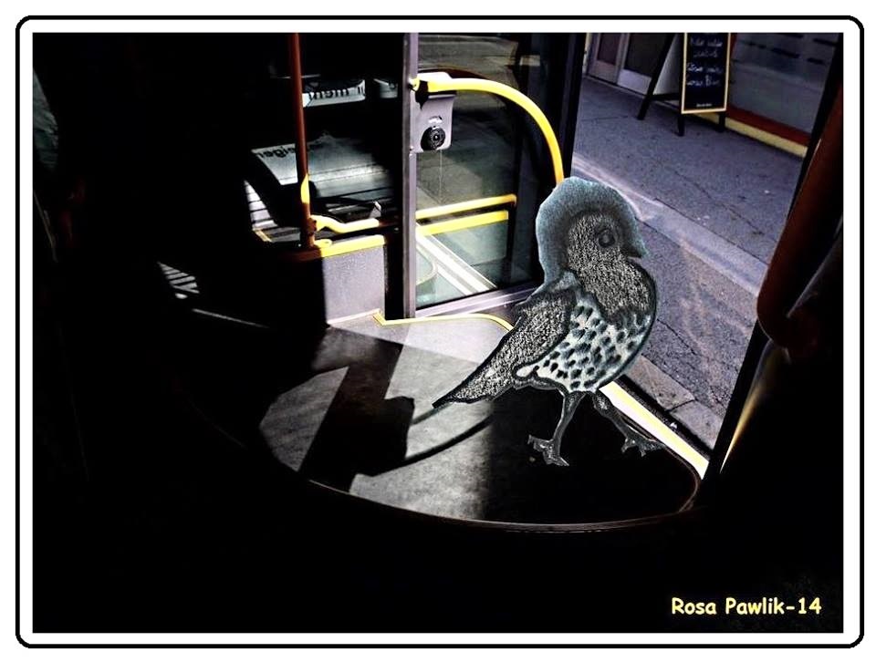 Da ich eine große Vogelfreundin bin, habe ich diese stolze Krähendame vor 2 Jahren gezeichnet und in mein Busfoto eingefügt. Titel: Krähendame steigt aus Bus ;-)