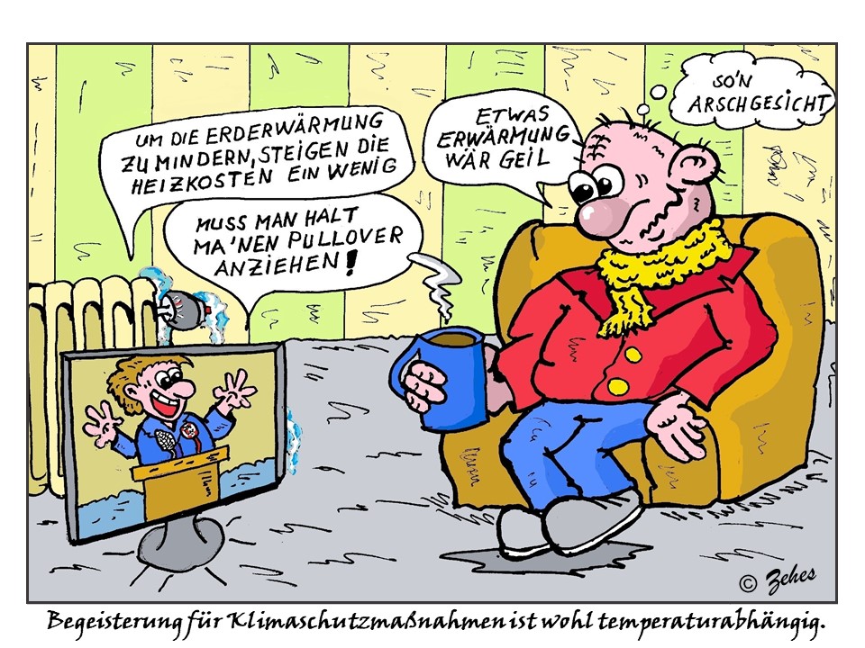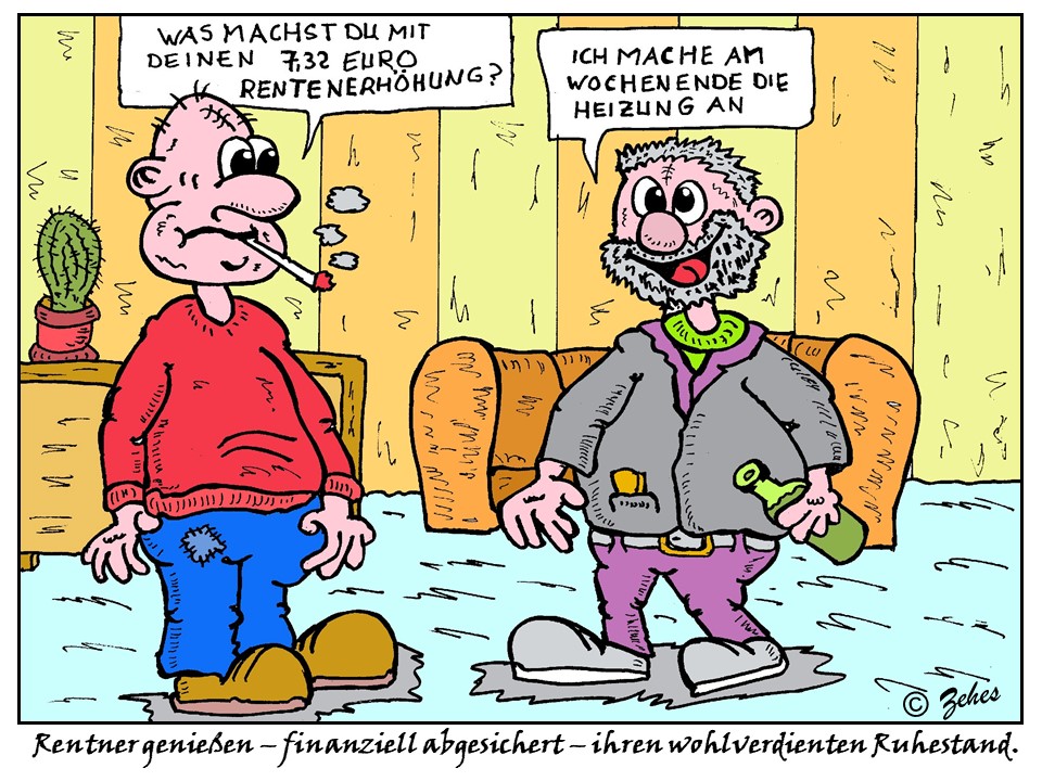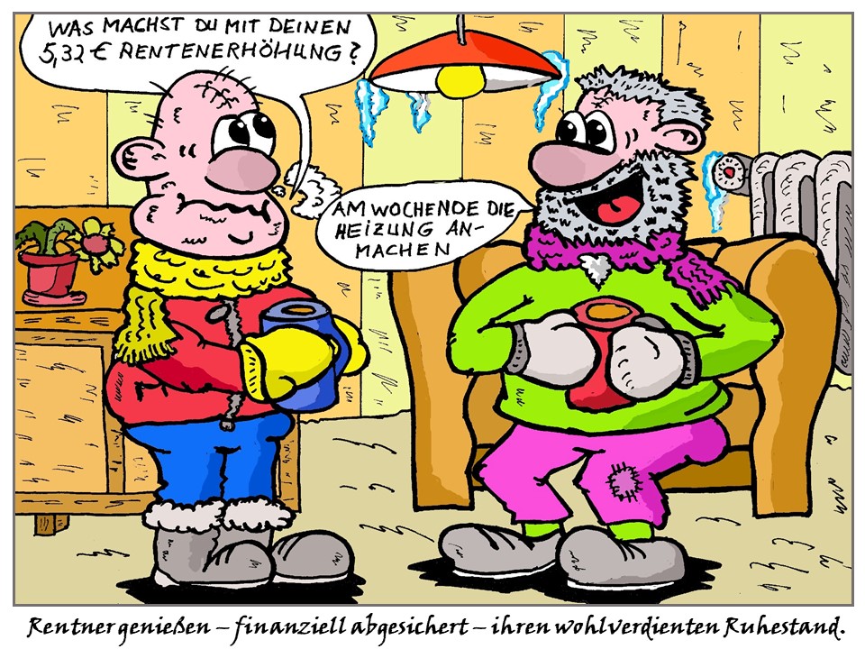 Und noch ein Nachtrag zu den Rentnern: Es wäre gut, wenn die ungeheizte Wohnung auch visuell zum Ausdruck käme. Ein Kaktus lässt ja eher an glühende Hitze denken. Vielleicht Eiszapfen an geeigneten Möbelstücken: Tischkanten oder Lampenschirme böten sich an, oder gleich ein 'untätiger' Heizkörper? (Ansonsten finde ich den super. Die nachfolgenden Cartoons sind auch sehr gelungen.)