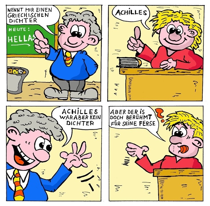 Aber vielleicht dann nicht mehr so gut verständlich für den Leser? Schwer zu sagen - ich finde, der Gag zündet auch so. - Jedenfalls schöner Kalauer.Beim Comic müßte man meiner Meinung nach "Verse" schreiben. Denn diesem Mißverständnis unterliegt ja der Schüler.