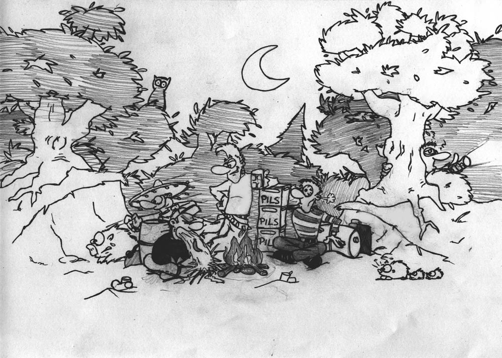 Freu mich immer, irgendwo einen Uhu zu finden ;) Der nette Herr im Vordergrund, der mit der Magenverstimmung kämpft, hat seine Hände locker im Schoß. Wenn ich mich entsinn, ist man dabei etwas verkrampfter und weiter vorn über gebeugt. Da, wo du die Hand erst hinzeichnen wolltest wäre es auch gut gewesen. Was auch nicht so klar ist, warum qualmt dem einen sein Schädel. (ist wohl ein hartes Stöffchen ;) ) Ist ziemlich eng an den Bierkisten. Hast du die Wutz noch eingefangen?