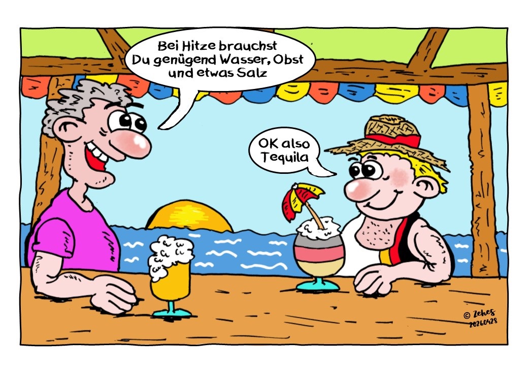 Im ersten Bild scheint sogar die Sonne selbst vor Hitze zu zerfließen. Der zweite Cartoon ist aber witziger und verströmt auch mehr Sommer-Sonne-Strand-Feeling. :thumbup: Interessanterweise bietet das Meer ein seltenes Naturschauspiel: das Links-Rechts-Gefälle. :D