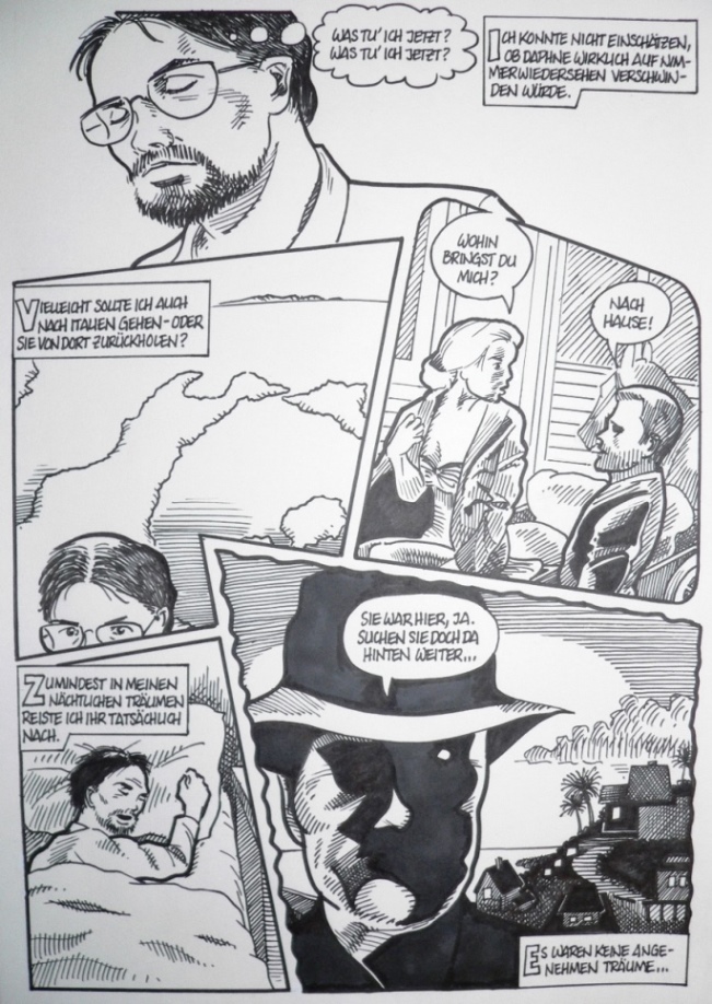 Es sind Träume oder könnten auch Gedanken sein. Wie du nach Italien Daphne nachfährst und sie nach Hause bringen möchtest. Rechts unten ist der Filmausschnitt. Beim Panel "Wohin bringst du mich - Nach Hause" nehme ich an das könnte auch ein Filmausschnitt sein oder ist das eher eine Gedanke, da die Panels Runde Ecken haben? Ich denke, das darf ruhig Interpretations Spielraum haben.