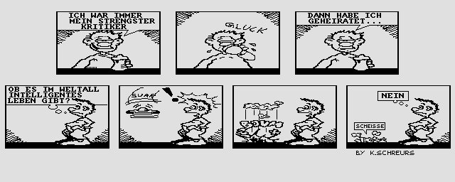Diese "Cartoons" von mir hab' in der Internet-Ablade eines ehemaligen Amiga 1000-Diskmags gefunden. Für dieser "1000er"-Mag hab' ich wohl mal probehalber (ich find's sonst keine mehr) einen Cartoon auf meinem 1000er mit DPaint gepixelt. Da dürfte ich um die 15 gewesen sein und war noch ziemlich "Hägar"-inspiriert...den ersten Gag dürfte ich davon sogar geklaut haben.
