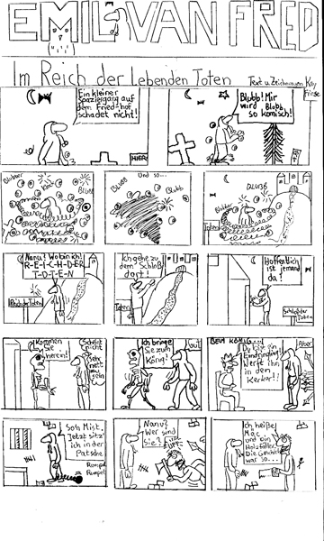 Ich schließe mich mal an. Finde den Thread sehr interessant ,vor allem auch die Abschweifungen... Folgendes habe ich mit 11 gemacht, "Emil van Fred". ich hab auch schon früher was gemacht, "FRIDOMAN", ein Typ, der, sobald er Eierschalen isst, Superkräfte bekommt. Also erstmal "Emil vanFred":