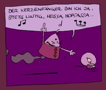 Immerhin, eine von den so zustandegekommenen Ideen gefällt mir ganz gut: Hohle Wesen, die mit heißer Luft gefüllt umherschweben :) :D Da die Luft natürlich irgendwann abkühlt, sind sie ständig auf der Suche nach kleinen Kerzen mit Beinen, um sich von diesen mit frischer Warmluft versorgen zu lassen! Die Kerzen wiederum sind sehr scheu und werden nur dann zutraulich, wenn ihnen Musik oder Literatur aus dem 18. Jahrhundert vorgetragen / rezitiert wird. Mal sehen, vielleicht denke ich mir noch ein paar Charaktere aus und mache eine Stripserie draus - könnte reizvoll sein :) Oder wenn ihr Anregungen habt, immer her damit!!