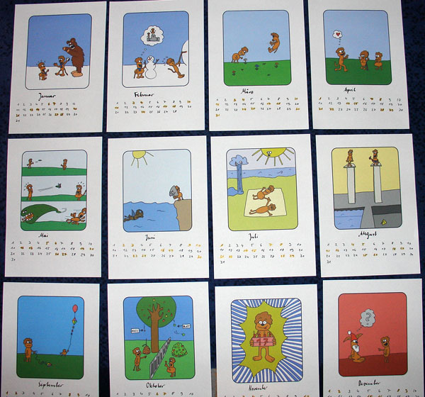 Ich schenk meiner Mutter ja auch jedes Jahr einen Kalender und bin da immer völlig gestresst weil ich zu spät anfange :D Diesmal bin ich Gott sei Dank rechtzeitig fertig geworden, ich kann deshalb nachvollziehen, was das für eine Arbeit ist (und ich hab noch nicht mal richtige Cartoons, sondern nur einfache Landschaftszeichnungen hergenommen, wenn ich mir für jeden auch noch einen Gag hätte ausdenken müssen...)