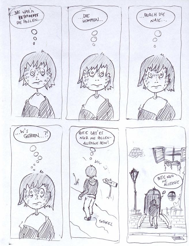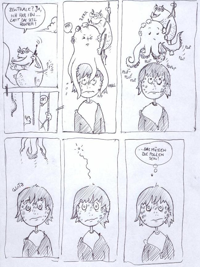 Deine Fortsetzung geht mal in ne ganz andere Richtung (wortwörtlich), was auch definitiv nicht schlecht ist. Das letzt Bild ist für mich aber etwas unklar, hat er jetzt einfach nur "mehr" Allergiepickel auf der Stirn oder ist das noch was ganz anderes?
